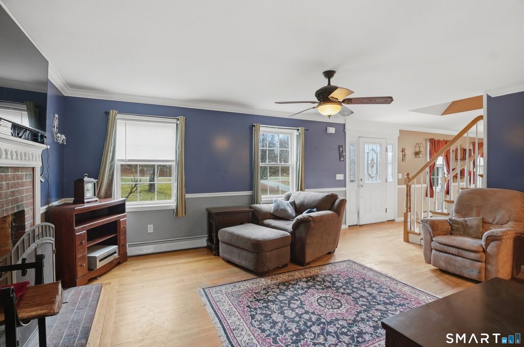 Classic Colonial charm meets modern comfort in this beautifully maintained home in Brooklyn, CT, offering three levels of sun filled living! The main level features a warm and inviting layout, including a spacious kitchen with rich cherry cabinets, stainless steel appliances, stylish backsplash, a large island, and a dining area with sliders leading out to the deck-perfect for indoor-outdoor living. The living room showcases hardwood floors, a cozy brick fireplace, and elegant French doors that open to a bright sitting room, while the formal dining room is accented with a classic chair rail. Upstairs, you'll find three well-appointed bedrooms, including a generous primary suite with a walk-in closet and en suite bath. The finished walk-up attic provides a third level of living, complete with a bonus room and fourth bedroom-ideal for guests, a home office, or hobby space. Set on 1.3 acres, the outdoor space features a tiered deck, above-ground pool, and plenty of room to relax or entertain. An attached garage and ample off-street parking complete the package.