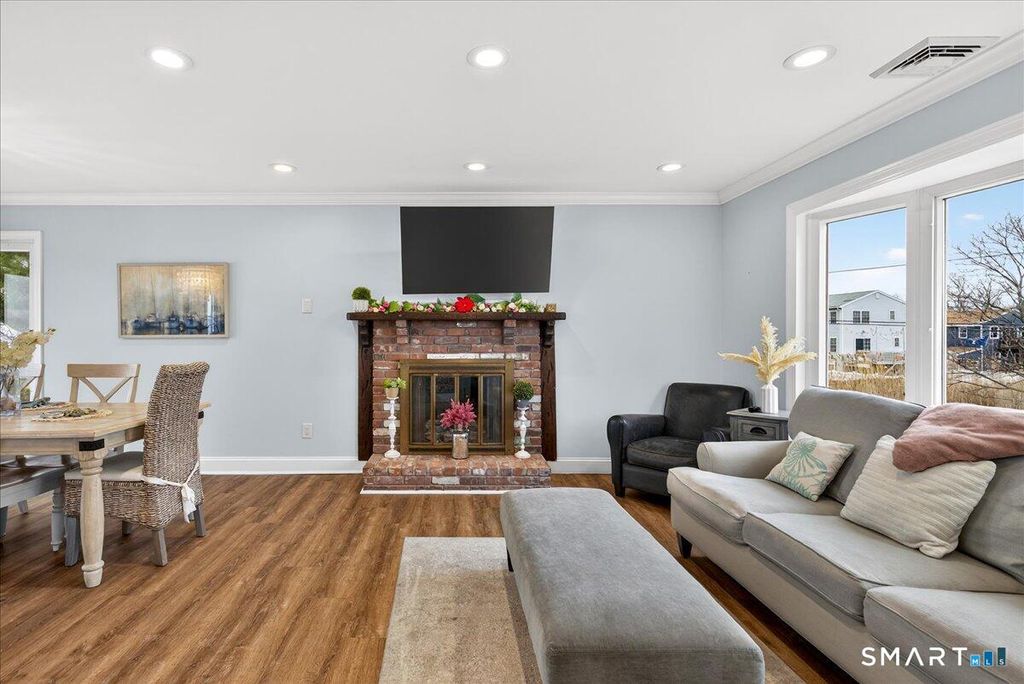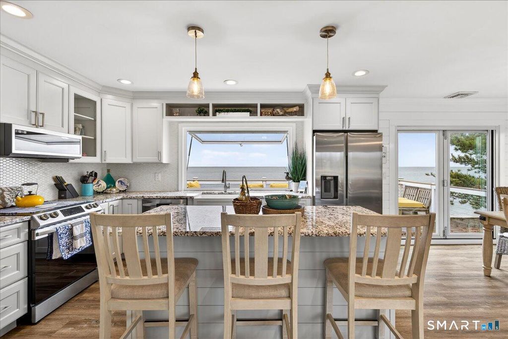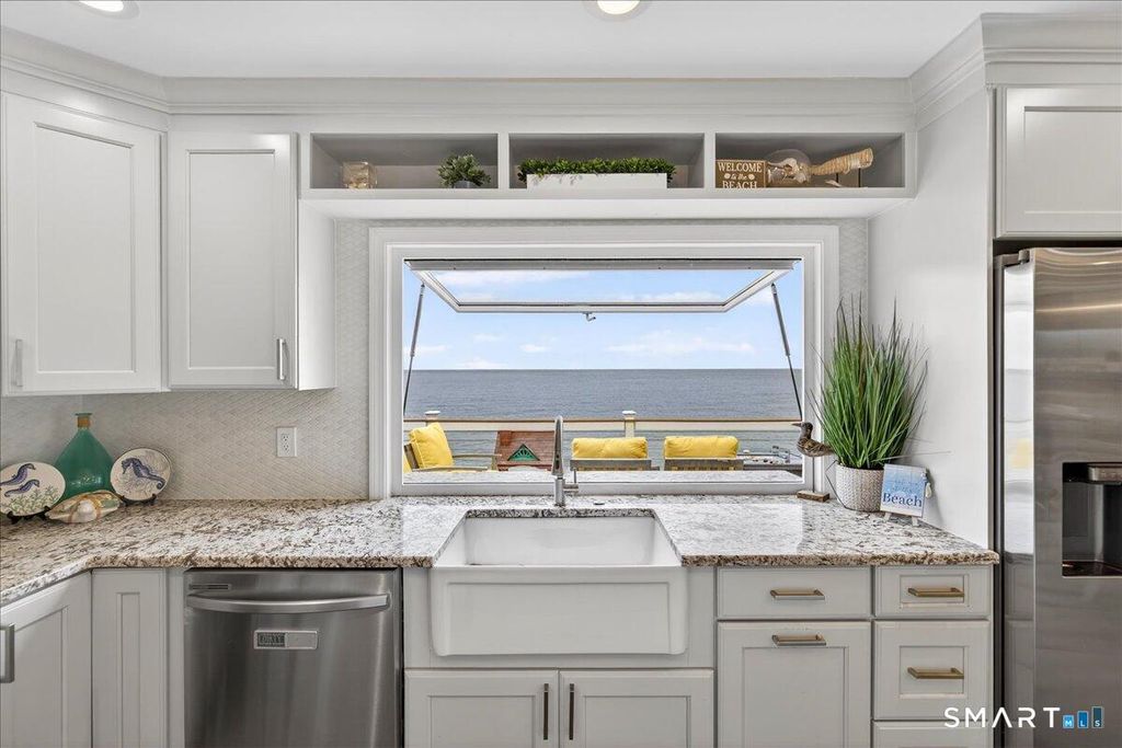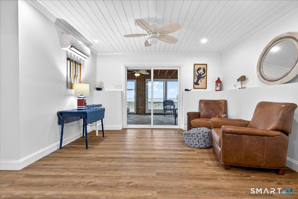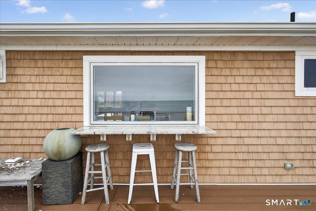 Waterfront on Morgan Point with 125' private sandy beach and southeast exposure, offering sweeping Long Island Sound views and beautiful morning light. Set between the shoreline and protected marshland, this property delivers rare privacy and a true coastal retreat setting. The main level features water views, including from the primary bedroom, and is designed for indoor-outdoor living with a folding glass door to the deck and a gas-strut pass-through window with granite counters extending outside. A three-season room surrounded by large sliding glass doors connects to a paver patio with firepit and additional outdoor space. Additional features include heat pumps, enhanced insulation, shake-style siding, fenced yard, ample parking, and available survey and elevation documentation.