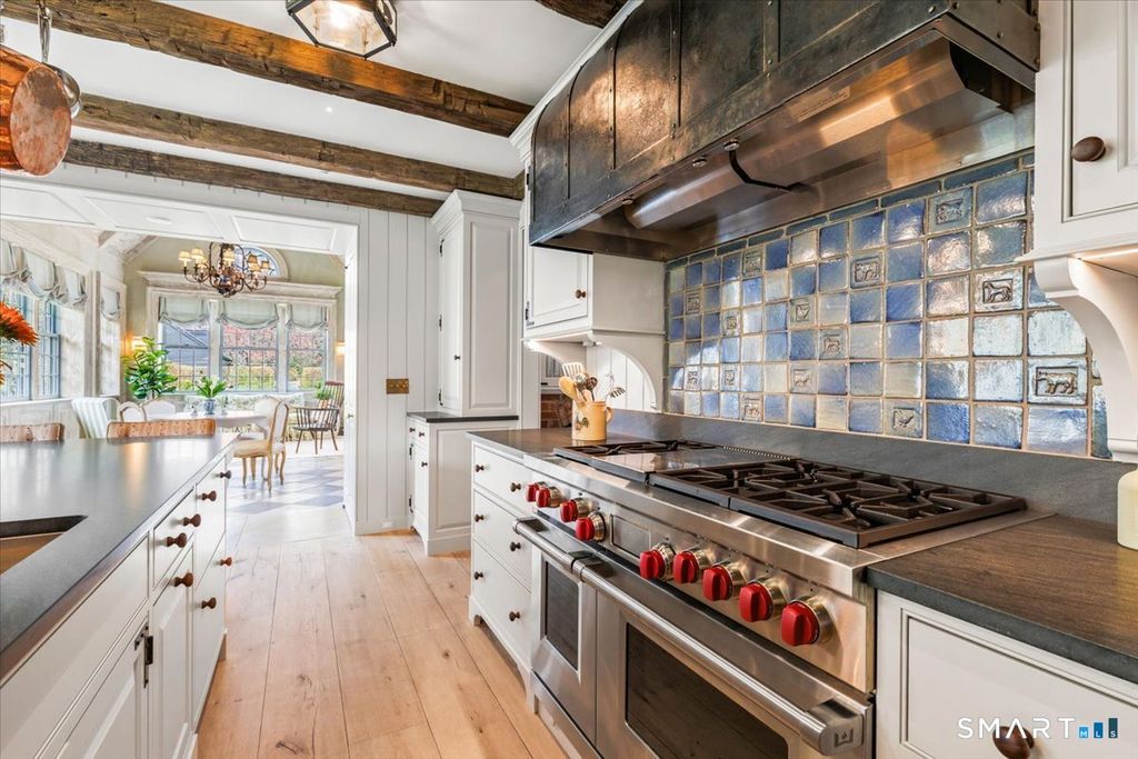 Welcome to 372 Brushy Ridge Road in the picturesque town of New Canaan, CT. A stone-pillared entrance leads you to this magnificent estate, meticulously transformed between 2022 and 2024. This 8,000+ sq ft home strikes a balance that is genuinely difficult to achieve: light-flooded and effortlessly modern, yet layered with warmth and character that only time can give. The four rooms at the heart of this home - the primary bedroom, kitchen, sunroom, and family room - each received transformations of the highest order. In both the primary suite and sunroom, rooflines were lifted to create spaces of extraordinary volume and light. The primary bedroom is a true sanctuary: soaring ceilings, new Marvin windows framing the treetops, an antique Delft-tiled fireplace, and a spa bath of the finest standard. The rebuilt sunroom, with vaulted beamed ceiling and Paris Ceramics heated reclaimed marble tile floor, is simply breathtaking, and the showpiece kitchen looks directly into it, featuring custom cabinetry, honed black granite, a butler's pantry, and Miele coffee station. Antique chandeliers, Ball & Ball hardware, Gracie wallpaper, and hand-scraped oak floors whisper of the home's soul - every finish custom, nothing left to do. Set across 3.5 enchanting acres designed by renowned landscape architect Kathryn Herman, the grounds evoke the quiet romance of the English countryside. A guest cottage and garaging for five complete this singular estate - minutes from town, worlds away.
