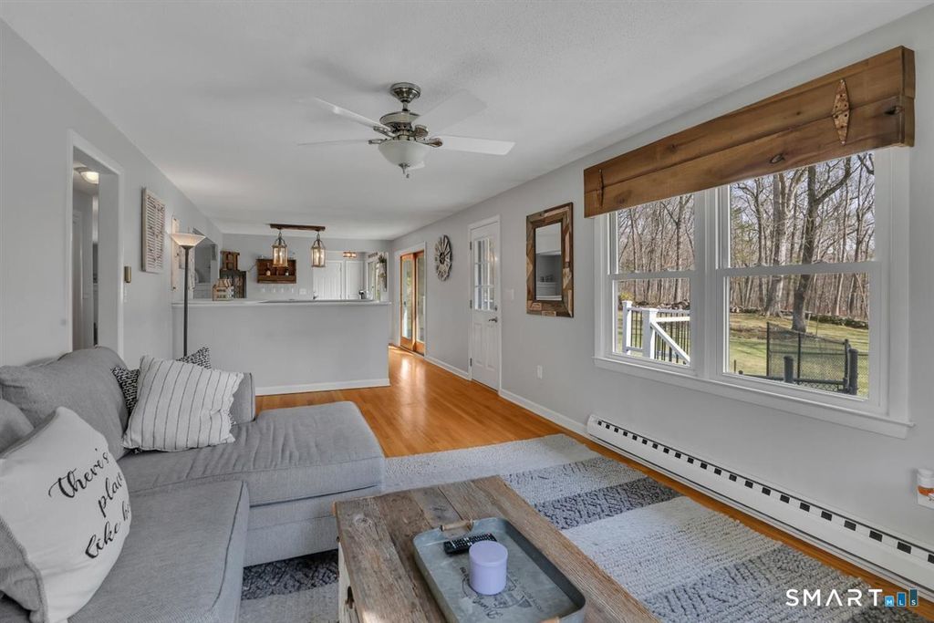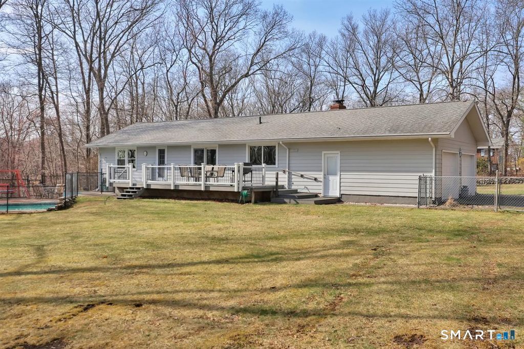 Enjoy easy, one-floor living in this beautifully maintained ranch featuring an open-concept layout perfect for today's lifestyle. Recently painted and truly move-in ready, this home offers a bright and inviting space for both everyday living and entertaining. The living room is warm and welcoming with a cozy fireplace, creating the perfect gathering space. The kitchen flows seamlessly into the living and dining areas, complemented by first-floor laundry and direct access from the garage for added convenience. The lower level offers excellent potential for additional living space, already equipped with a half bath and a wood stove-ready to be finished to suit your needs. Step outside through the slider to a spacious Trex deck with vinyl railings, overlooking a flat, private, tree-lined yard. Your own backyard retreat awaits with an in-ground pool, ideal for summer gatherings or peaceful relaxation in a serene setting.
