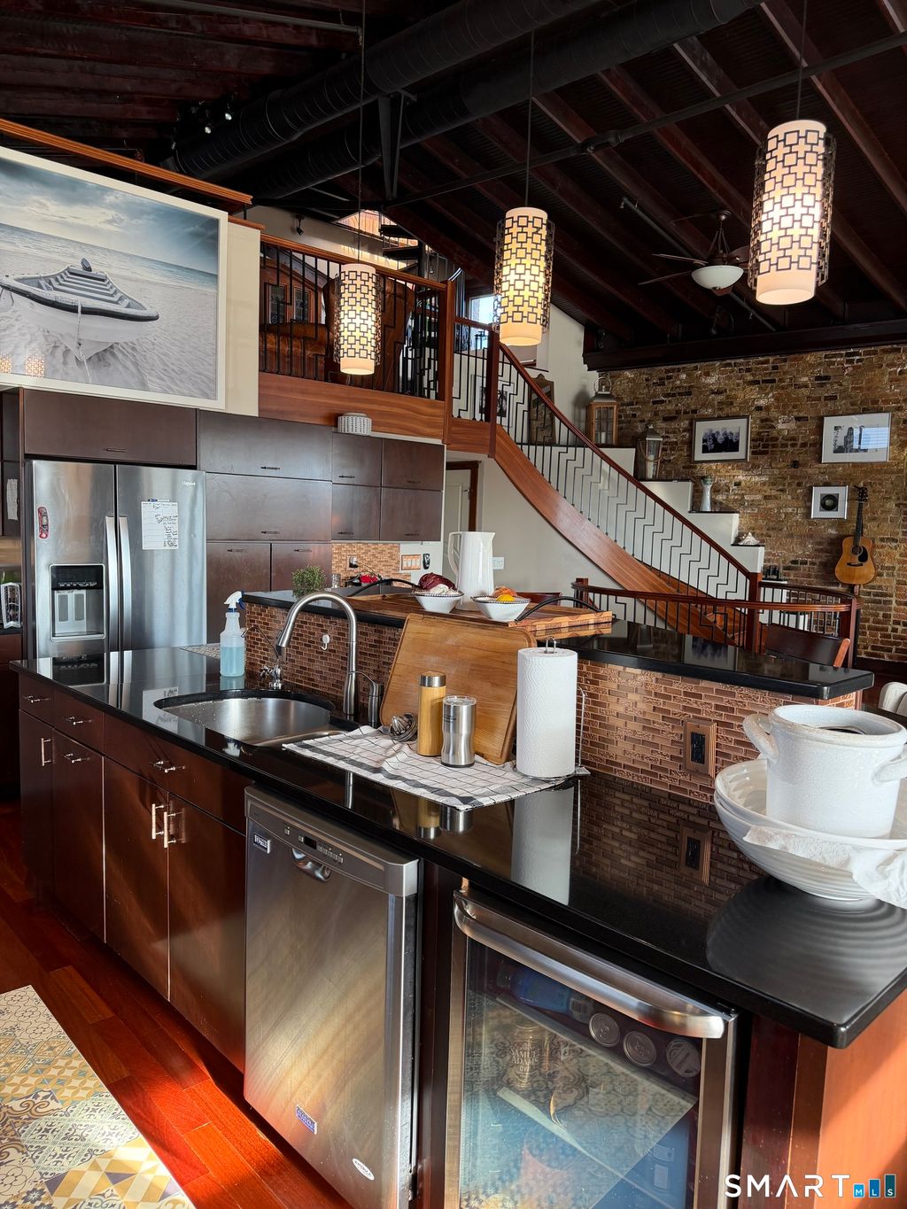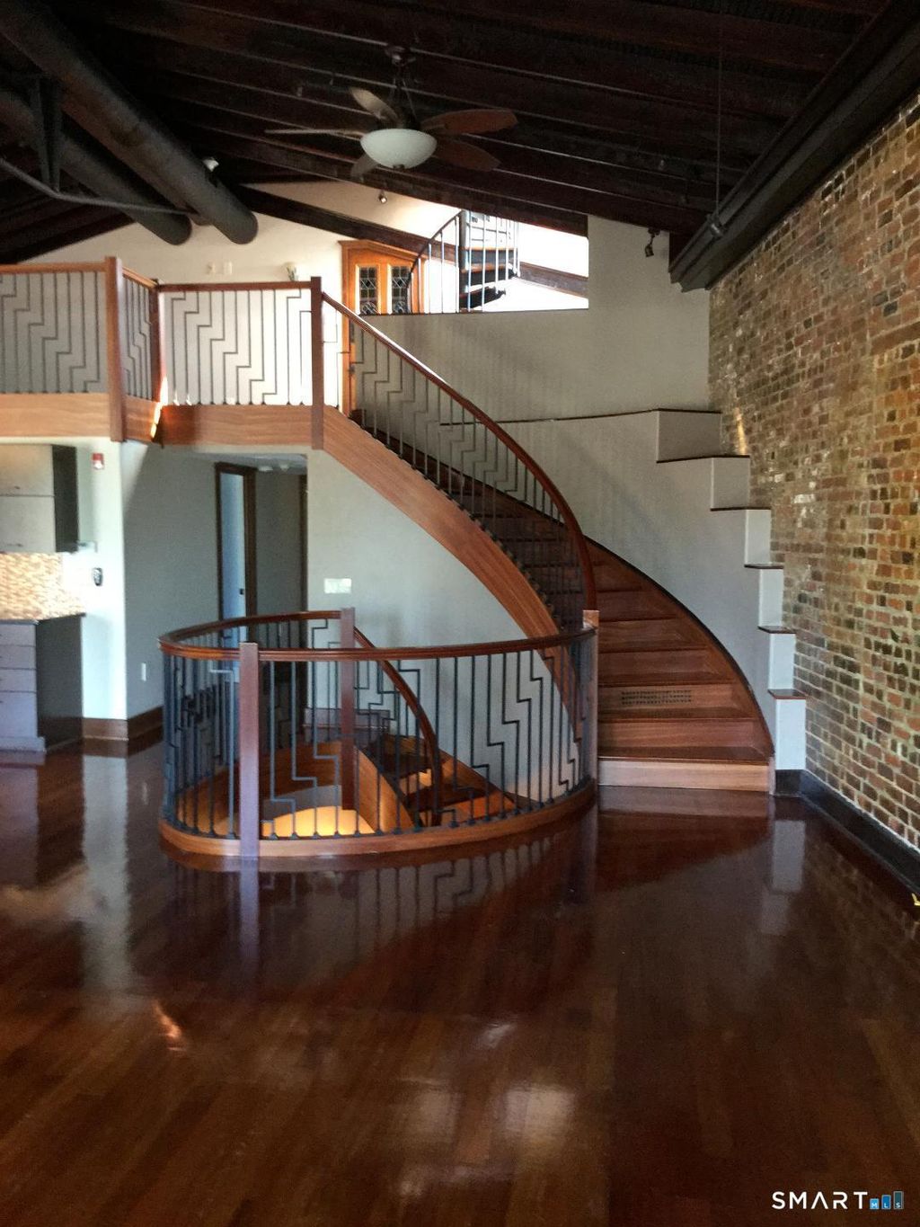 This apartment is one of a kind! Located in historic Milford Connecticut on the Green. This is a New York style penthouse tucked away in the center of a charming New England town. The spiral staircase takes you to the main living area with cathedral ceiling, full wall of brick and full wall of windows, open living room - dining room separated by a double glass gas fireplace, and french doors to a balcony overlooking Milford Green. The gourmet kitchen has a two tier granite island, state of the art appliances, wine chiller bar sink and pantry. The primary bedroom has double walk-in closets, full bath with infinity soaking tub and steam shower, double sinks and towel warmer. Open the french doors to a large outside patio/deck. There is a second bedroom with walk-in closet and built-ins and a full bath across the hall. Take the spiral staircase to a spacious loft overlooking the main living area. Another spiral staircase will take you to the rooftop patio that overlooks the town center. The unit includes a full size washer and dryer on the main level, central a/c and central vacuum. A new parking garage and Metro North Train station are just a three minute walk away. Everything is just steps away.......shops, restaurants, entertainment, library, art studio, town green, duck pond, waterfall, post office, banks, Milford harbor and so much more!
