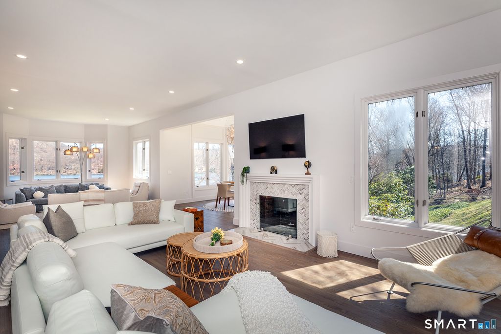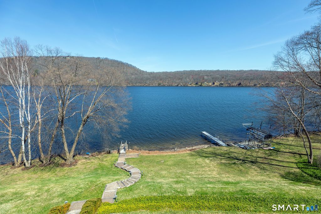 An Exceptional Renovated Waterfront Retreat, set majestically on 5.19 private acs. offers 400' of frontage on Candlewood Lake complete w/private dock & sand beach. Enticing outdoor spaces include the heated, in-ground pool w/bluestone patio overlooking the lake, An expansive 20 X 40 deck on main level & a walk-out, lower level to a stone patio w/fire pit; ideal for summer entertaining! Approach the entry through glass doors to the 2 story foyer w/turn stair & modern lighting. French doors on the left, open to the formal dining room w/built ins, custom light fixtures & moldings. An expansive 38 ft great room w/marble fireplace, surrounded by windows exudes a warm, comfortable ambiance. A second stone fireplace warms the family room, ideal for TV viewing, reading or just relaxing. Custom millwork, built-ins, hardwood floors & a plethora of windows, showcase the views from every angle. The Chef's kitchen boasts Wolf appliances, marble countertops, wet bar & stunning center island plus a designer range hood! The enticing primary suite hosts his/her bathrooms, WIC, built-ins & loft w/ views. Three other designer bedrooms offer a Jack & Jill bath & an en-suite. An expansive lower level boasts 15 ft. ceilings, recreation space with stone fireplace, half bath, wet bar, bunk room w/full bath & a 5th en suite bedroom w/full bath. An additional full bath for future movie theater, 3 laundries, 3 car gar. plus SHC amenities:tennis, community beach, clubhouse. A one of a kind lake find!