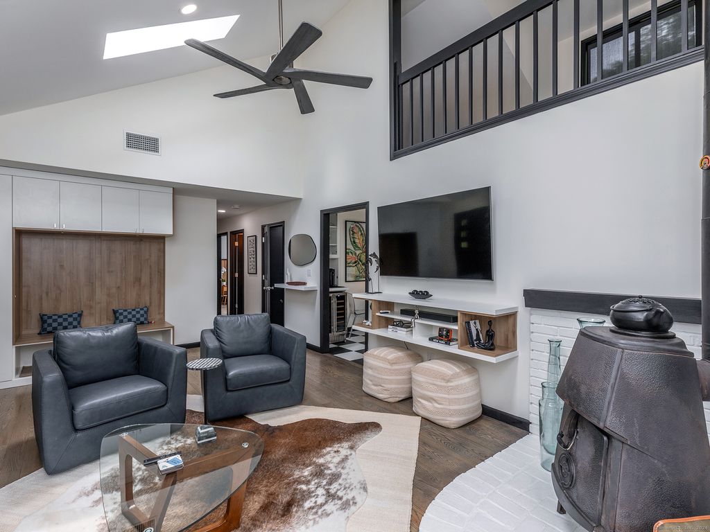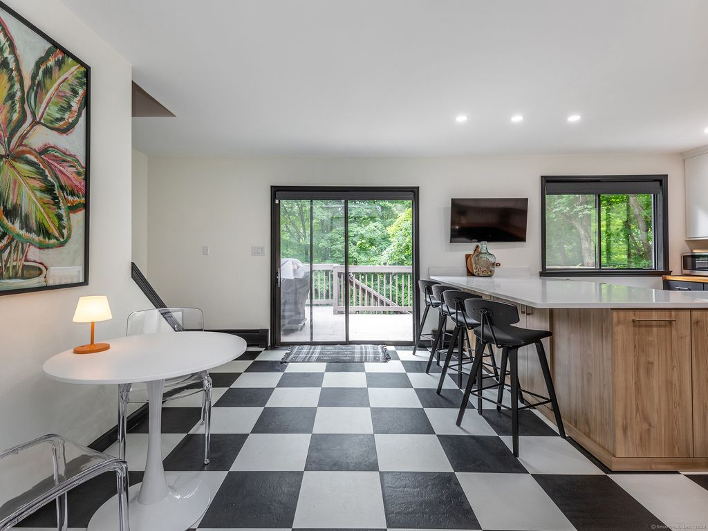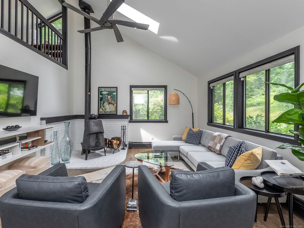 Stylish and well appointed 3 bedroom 2 and 1/2 bath contemporary cape surrounded by nature. Set back on a scenic road, this home offers bright and airy spaces including dramatic 16ft ceilings in the living room with wood burning stove. Large, modern kitchen with brand new island with seating and convenient access to outdoor deck for entertaining. Primary bedroom with ensuite 1/2 bath, additional guest room and full hallway bathroom on the main level. Well maintained hardwood floors. 2nd floor loft for relaxing or separate office space. Lower level can be used as a comfortable guest suite and has a bonus living space with kitchenette, media room with movie projector, bedroom and full bath. Separate private entrance and walk out to spacious backyard with firepit. Close to Kent, New Preston and Washington for shopping and dining. Good proximity to hiking trails. 90 min to NYC.
