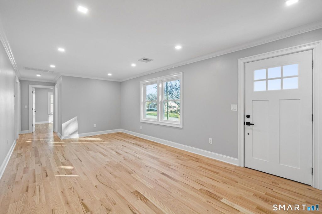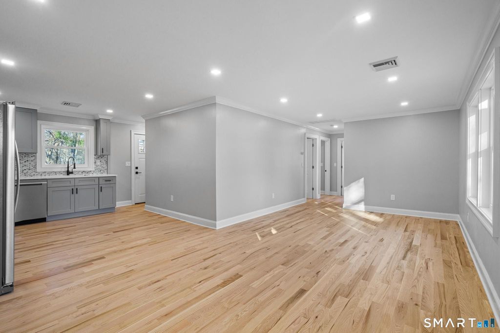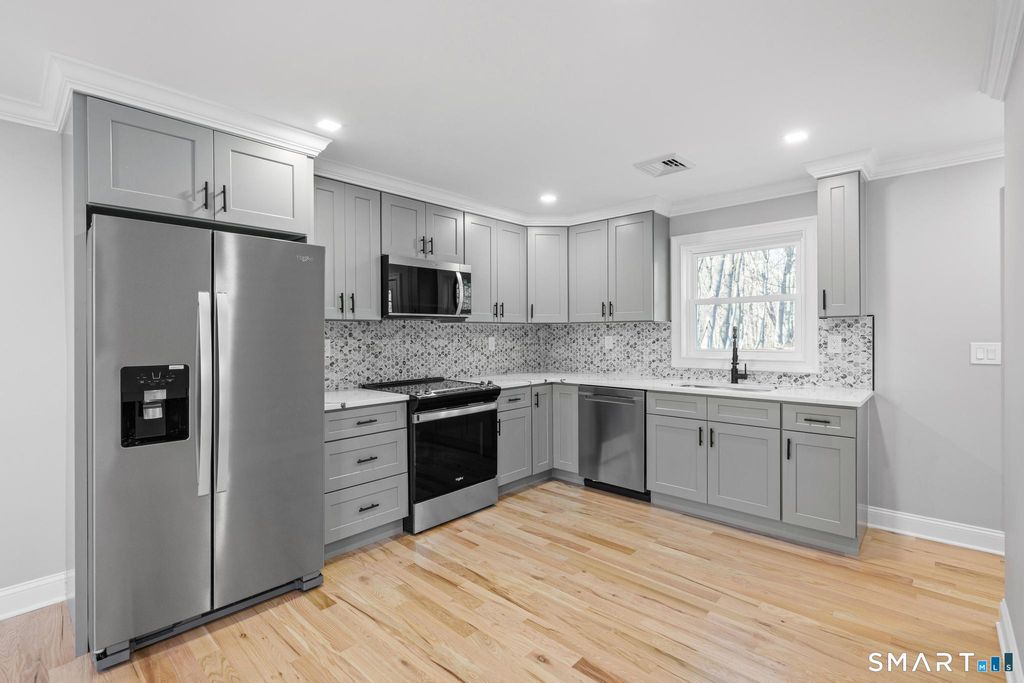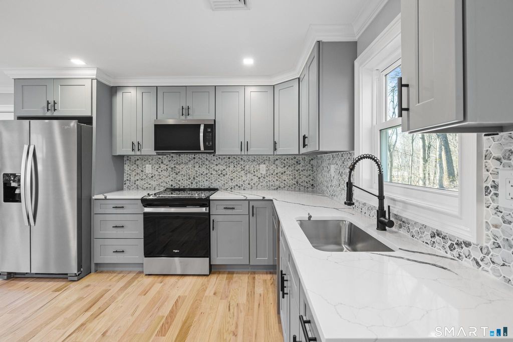 Fully renovated and move-in ready, this 3-bedroom, 1.5-bath home is located on a quiet dead-end street just minutes from downtown Bethel. The main level features an open layout with brand new hardwood floors and a modern kitchen with quartz countertops, custom cabinetry, stainless steel appliances, and a designer backsplash. The fully finished lower level offers additional living space with a half bath, perfect for a family room, office, or gym. Major updates include central air, new roof, siding, windows, and mechanicals. Private yard, attached garage, and a prime location close to shopping, dining, and more. Turn-key and ready for its next owner.
