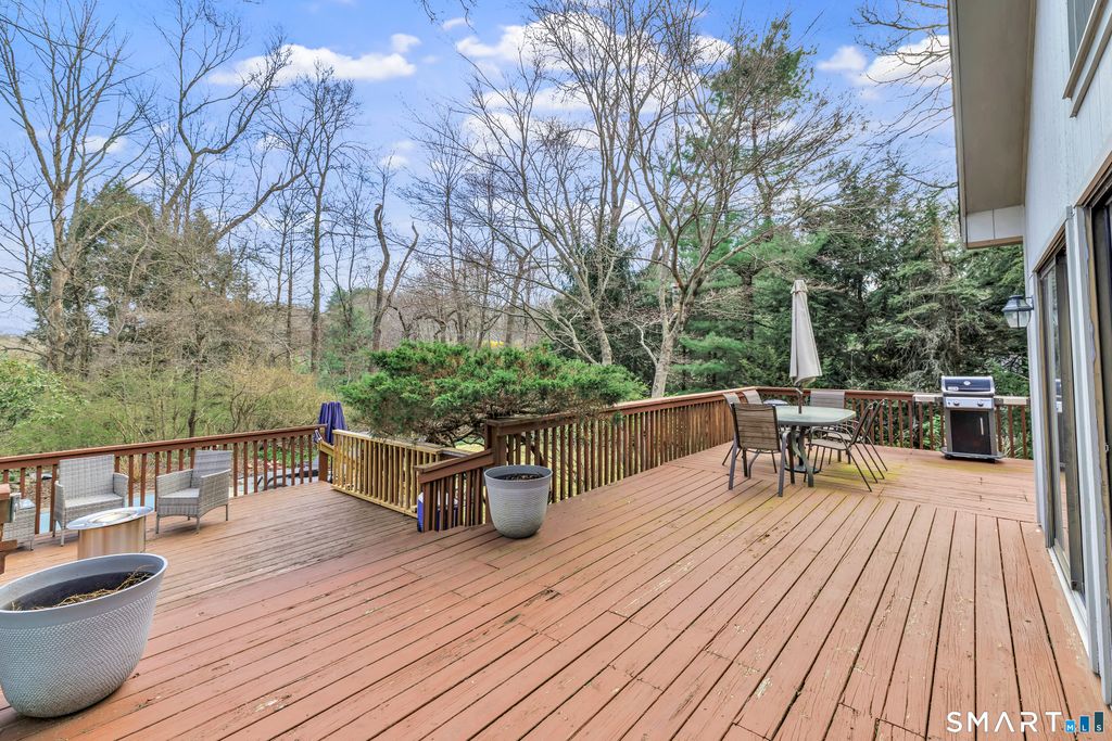 Perched at the top of a hill at the end of a shared drive, 16 Mountain Road offers a rare blend of privacy and convenience in the heart of Georgetown. This contemporary split-level is designed for easy living, featuring a sun-filled open kitchen and family room that flows seamlessly into a vaulted sunroom with a cathedral ceiling, bringing the outdoors in. The upper level includes four bedrooms, highlighted by a spacious primary suite with en-suite bath. The lower level adds approximately 750 square feet of flexible living space, complete with a second family room with fireplace, a private office or optional bedroom, laundry, and a powder room. Outdoor living is just as impressive, with an expansive 1,000+ square foot deck overlooking a 50-foot pool and flagstone patio-ideal for entertaining or relaxing. Set on beautifully landscaped grounds with mature plantings and seasonal color, this property offers a peaceful retreat just minutes from Wilton Center, schools, and commuting routes.