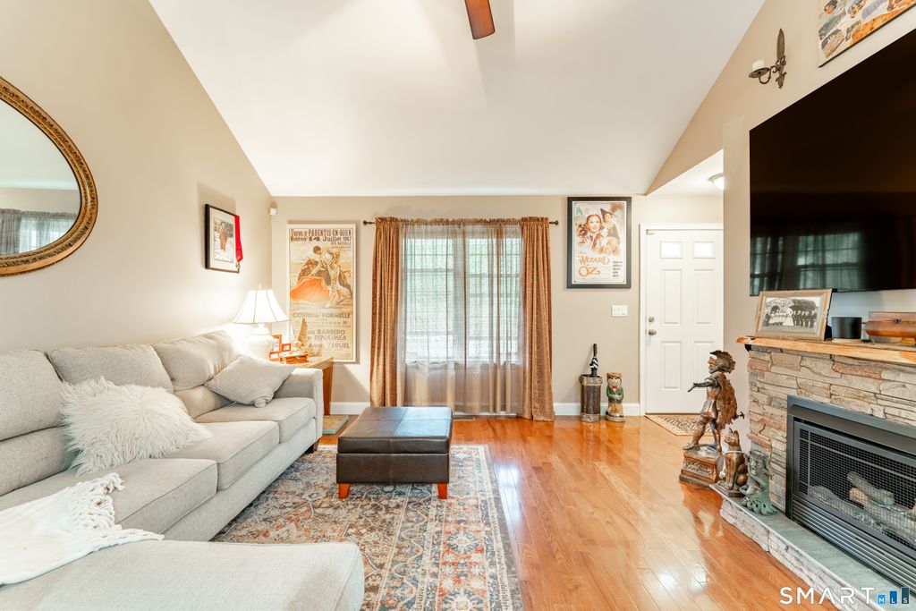 Welcome to Eagle Ridge Estates, a quiet, well-maintained community. This beautifully designed 2 bedroom, 2.5 bath ranch style condo offers refined comfort, flexible space, and open concept living. The living room features vaulted ceilings, a custom gas fireplace that serves as a warm focal point and hardwood floors. The kitchen includes updated appliances, abundant cabinets, granite countertops, and a dining area framed with bow windows that draws in the natural light. The primary suite features a jetted soaking tub and walk in closet. A second bedroom, half bath with laundry, round out the main floor. The true standout to this home is the finished lower level with it's own private entrance, gas fireplace, dry bar, recreation/office space, full bathroom with gorgeous tiled shower, and walk in closet. An ideal area to covert into a third bedroom/guest quarters/in-law. Additional storage and gym space. Add in a finished garage with Trac flooring and storage cabinetry. Step outside onto your private composite deck for alfresco dining or morning coffee, or explore the scenic walking trails. Enjoy low maintenance living just 20 minutes to RI, 90 mins to Boston, 3 hrs to NYC.