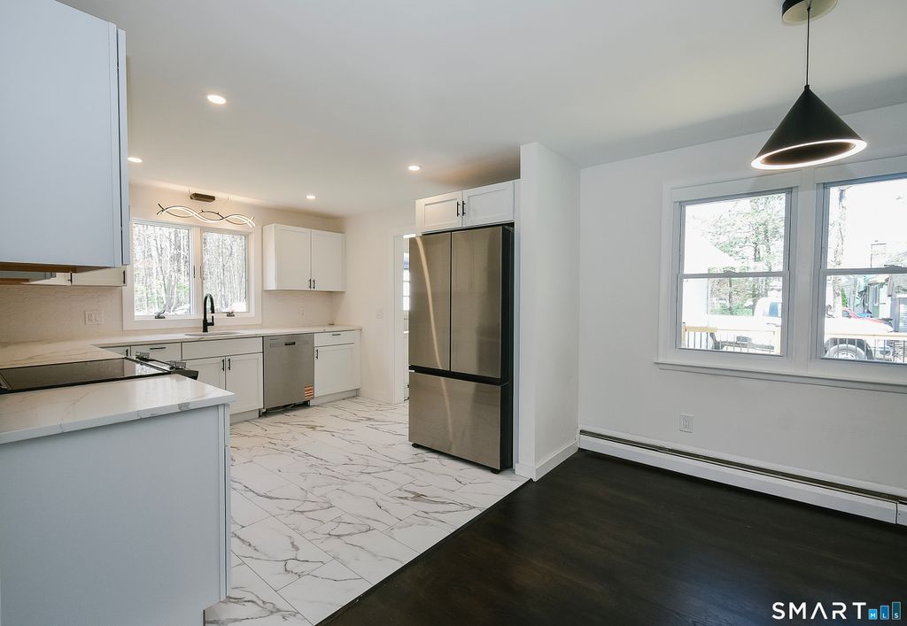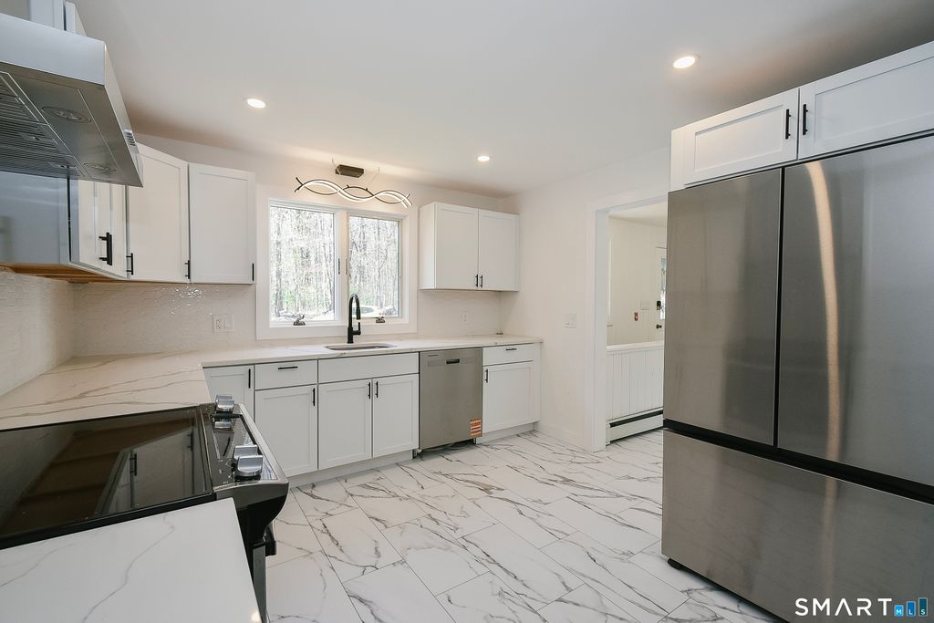 This stunningly renovated ranch on the east side of Torrington offers the perfect blend of modern sophistication and one-level convenience, situated just minutes from Target, Walmart, and all three local Starbucks. The bright, open-concept interior features gleaming dark hardwood floors and a striking floor-to-ceiling stone fireplace that serves as the heart of the living space. A chef-inspired kitchen boasts crisp white shaker cabinetry, elegant quartz countertops with waterfall edges, and a designer marble-style tile floor, while the bathrooms are beautifully finished with contemporary vertical subway tile and sleek black hardware. With its sprawling layout and a finished basement that provides excellent potential for a private multi-generational suite or additional living area, this move-in-ready home is designed to handle both busy family life and stylish entertaining with ease.